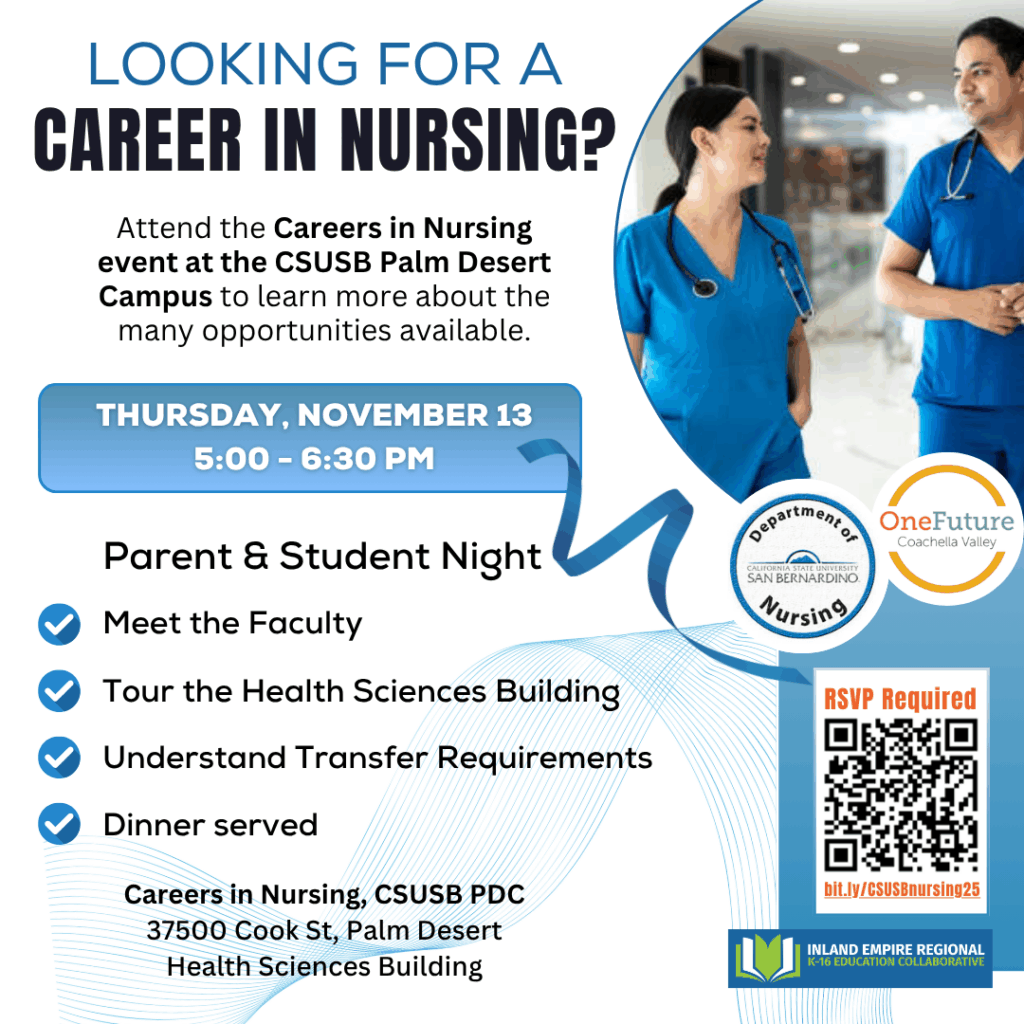 Explore your future in nursing at the CSUSB Palm Desert Campus Open House! This special event is designed for students and professionals interested in pursuing or advancing a career in nursing. Meet with faculty, current students, and healthcare professionals to learn about degree programs, career pathways, and the growing demand for nurses in our region.